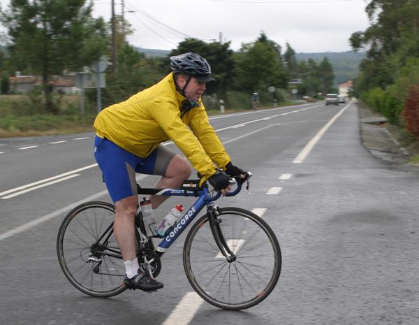 David grins childishly as he sprints past a 90 year old pilgrim on an old bike just before lunch